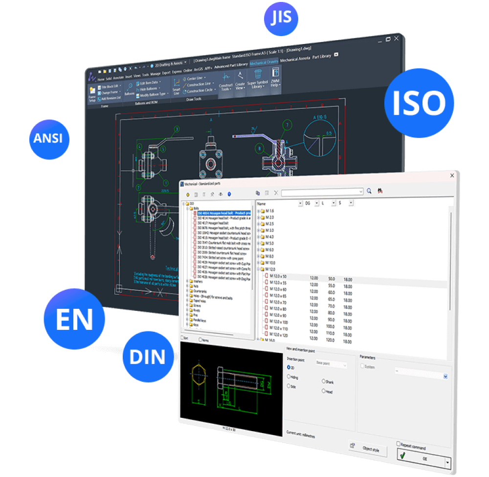 Crearea rapidă a desenelor conforme cu standardele naționale și internaționale, inclusiv ISO, EN, DIN, ANSI, ASME, PN, IS, JIS și multe altele. De la șuruburi la șuruburi și nituri la știfturi, veți găsi Părți potrivite pentru fiecare proiect.